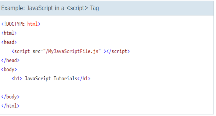 Above, the 'script' src="/MyJavaScriptFile.js"> points to the external JavaScript file using the src="/MyJavaScriptFile.js" attribute where the value of the src attribute is the path or url from which a file needs to be loaded in the browser. Note that you can load the files from your domain as well as other domains.