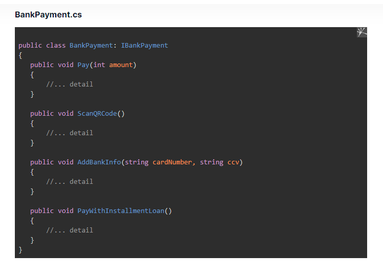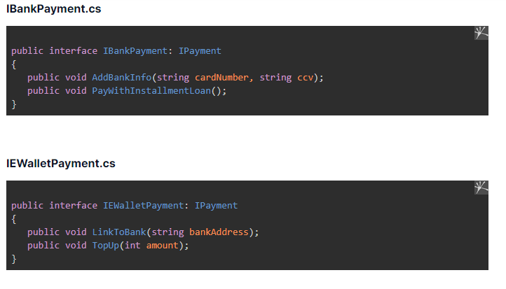 Therefore, we hold the common function in the IPayment interface and create specific interfaces, which contains specific functions for each payment method.