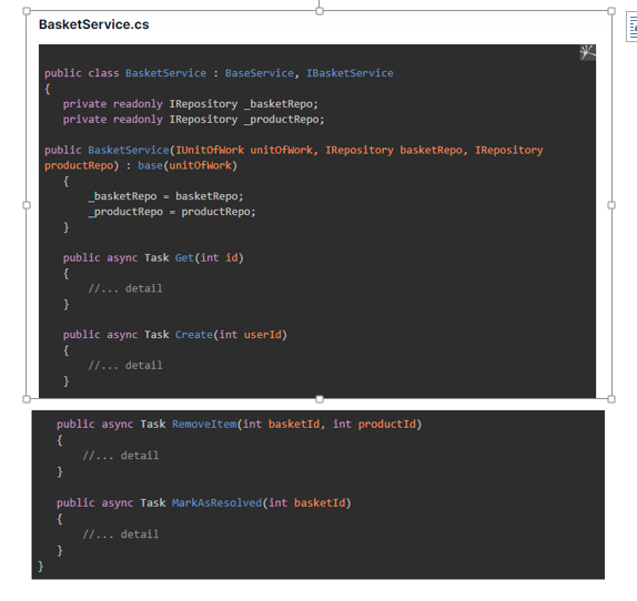 Then, the BasketService class will inherit the IBasketService interface and implement all functions that have been defined. This ensures details depend on abstraction.