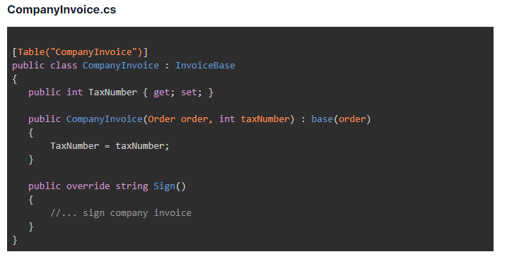 On the other hand, if we inherited PersonalInvoice from CompanyInvoice, they would affect the correctness of the application. At that time, the personal invoice can’t have a tax number. Thus, it would be an inappropriate use case that we should avoid.
