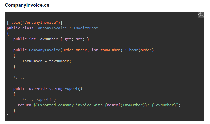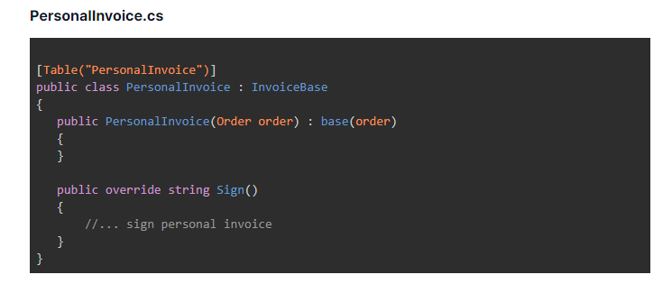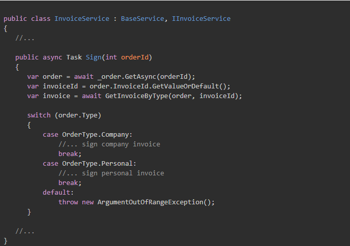 Let's look at the code. The following example shows that signing implementation details of two invoice types are placed in InvoiceService. They work totally fine, but outside their core class (CompanyInvoice & PersonalInvoice). As a result, they are not closed for modification.