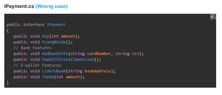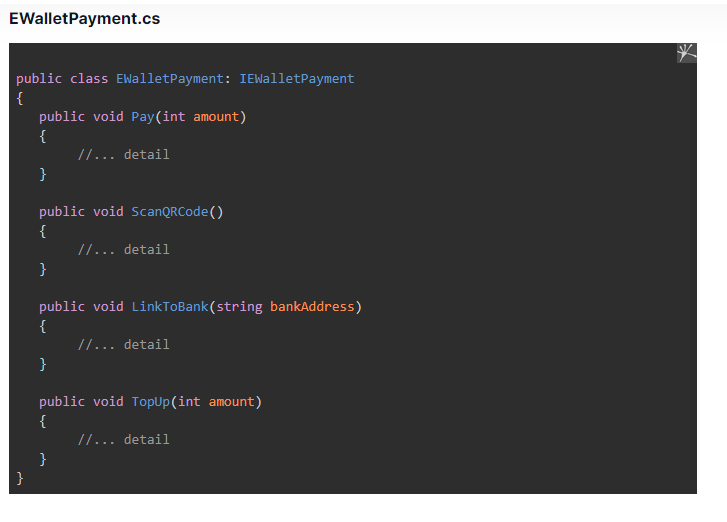In the requirement, our order fulfillment application allows 2 payment methods. The first is paying via bank account, and the second is via e-wallet. Here is the wrong way to code.