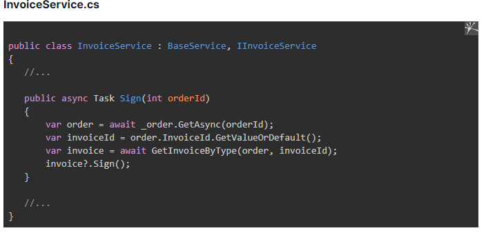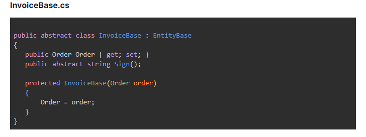 To fix them, we will create the InvoiceBase abstract class, which defines common methods required in invoice features. We also place the abstract Sign() method in the base class.