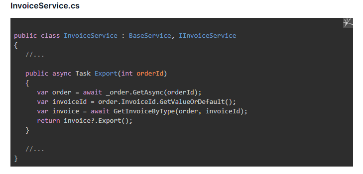 In InvoiceService, we implement the Export() method, which will export the details of the invoice based on its type.